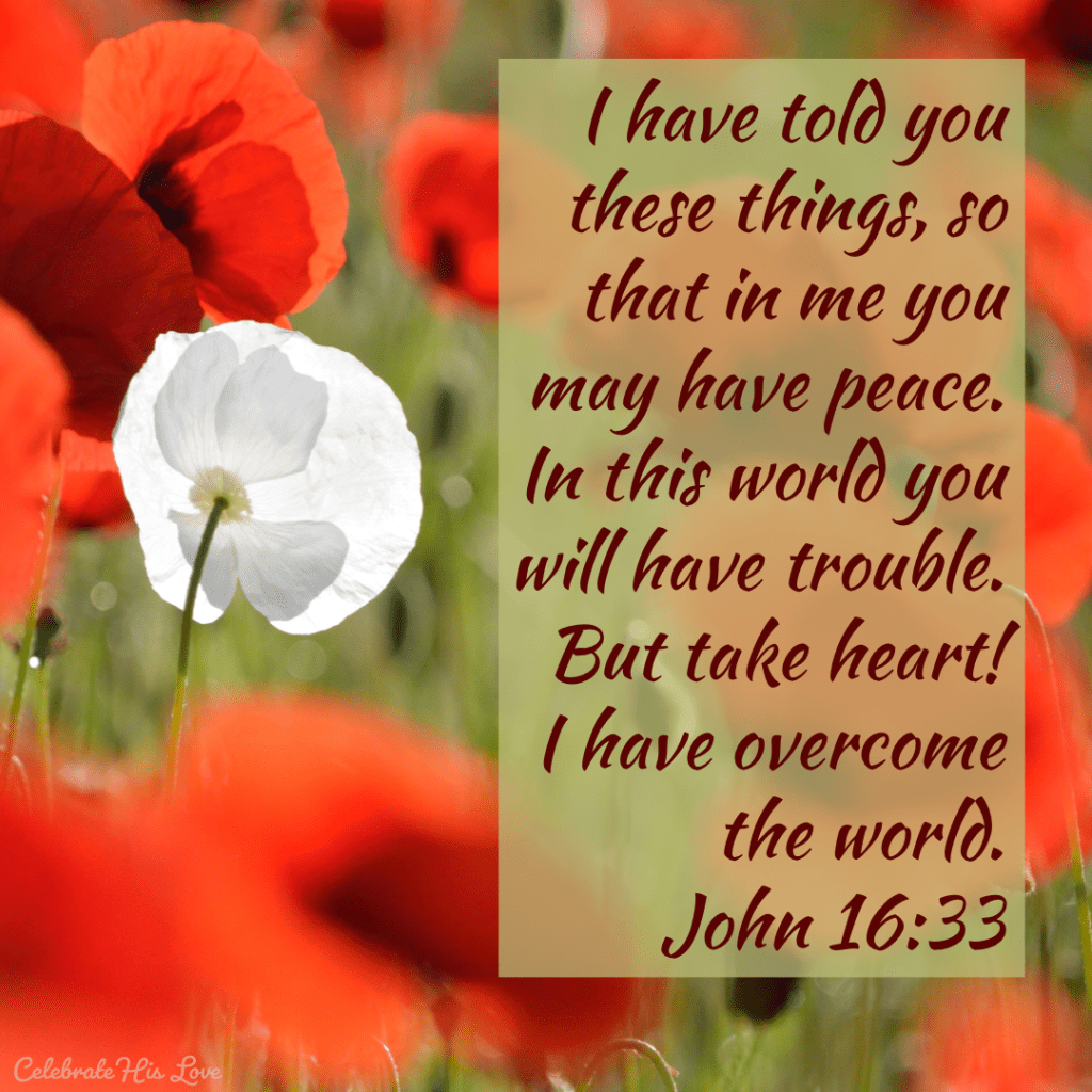 With that said, I thought this graphic was perfect for today’s verse… When “the peace that passes all understanding” envelopes our very souls, we stand out in the world as beautifully a white poppy in a field of red ones! I pray this kind of overcoming peace for you today, and that you can take heart! 🙏🏻😌❣️